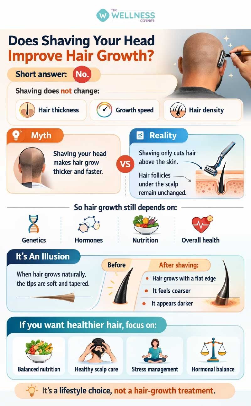 Shaving your head does not make hair grow faster, thicker, or stronger. The growth of your hair is determined by your genetics, hormones, and overall health rather than the way you cut it.