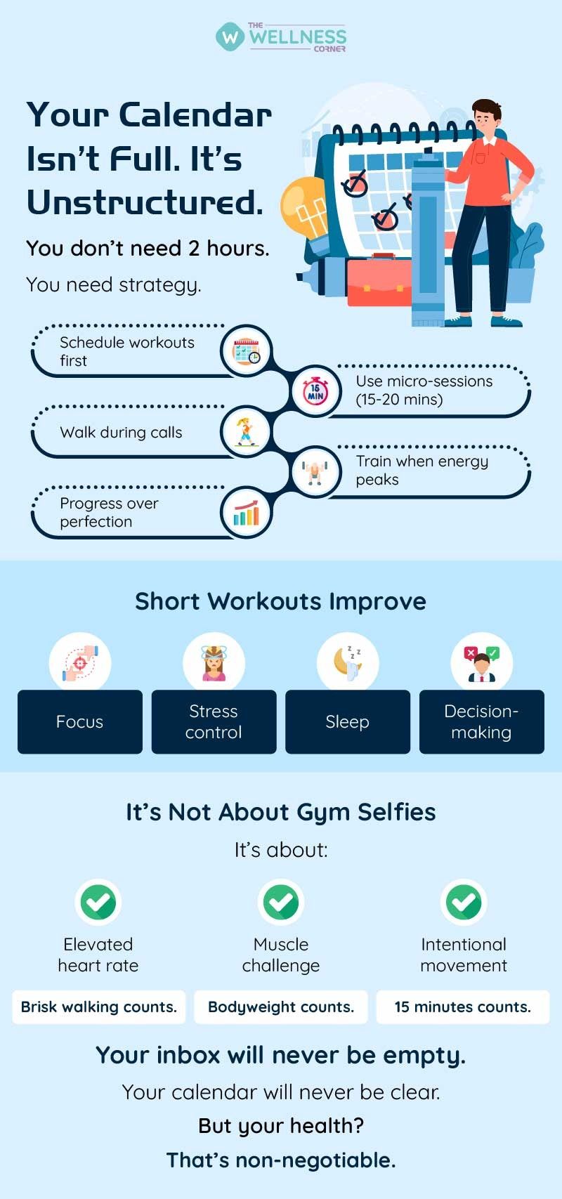 Between back-to-back meetings, endless notifications, tight deadlines, family commitments, and the invisible mental load we all carry, fitness often gets pushed to the bottom of our to-do lists. Not because it is unimportant. But it feels optional when compared to everything else demanding your attention.