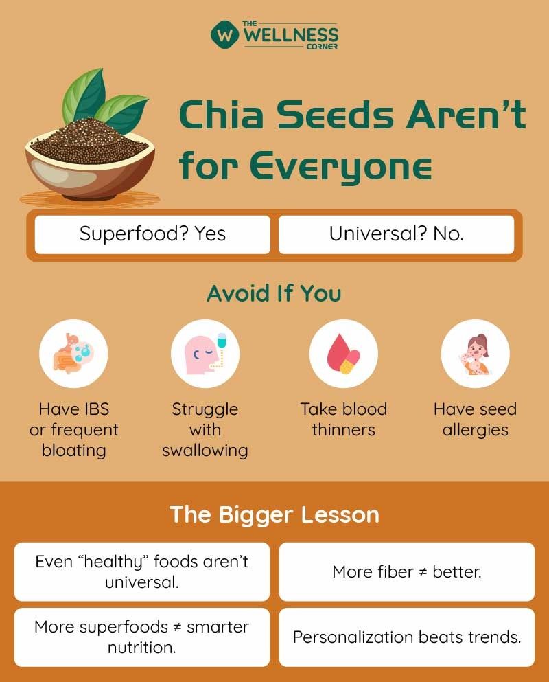 If your digestive system reacts strongly to seeds, raw fiber, or bulky foods, it is safer to avoid chia seeds altogether or consult a nutrition professional before using them.