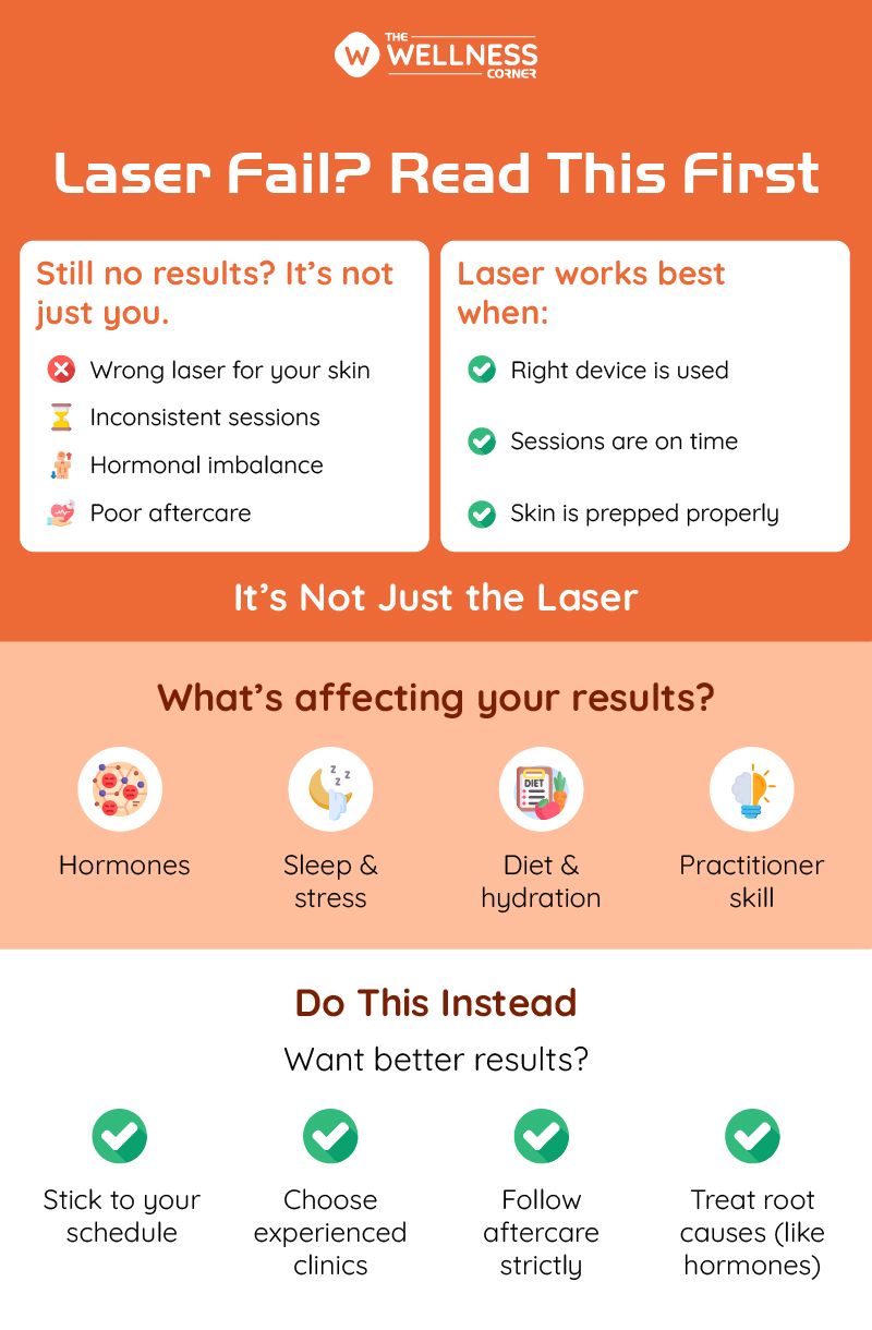 This could be due to factors like skin type, hormonal issues, incorrect laser technology, or inconsistent sessions.